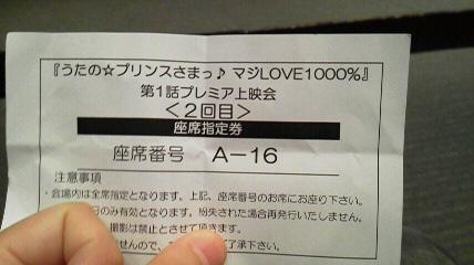 おおおぉぉおおおぉお…ガタブルしつつ席に入る前に音也のコスプレした人から、うたプリのインフォメーションが書かれたアニメのポストカードとチラシを受け取る。この時、一瞬だけ癒されたが絶対受け取る時の手が震えてたに違いない(笑)